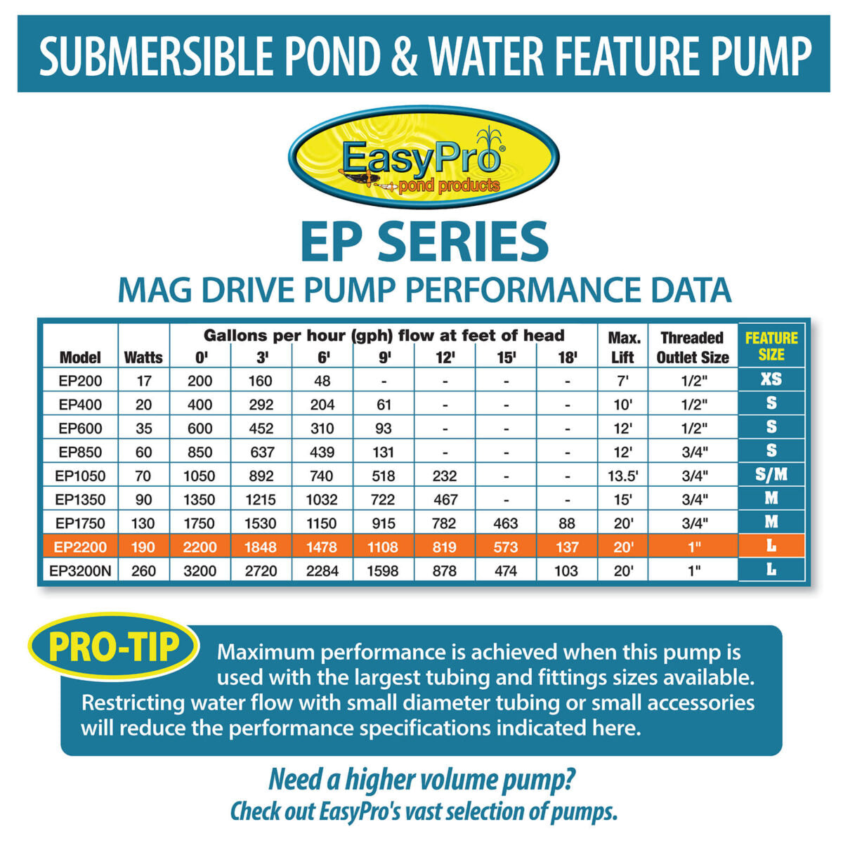 The EasyPro EP2200 is built to deliver consistent performance with low energy costs and long-lasting durability, making it a smart choice for pond owners and professionals.